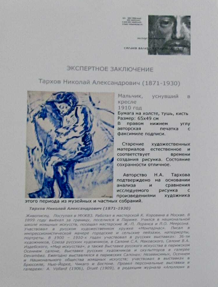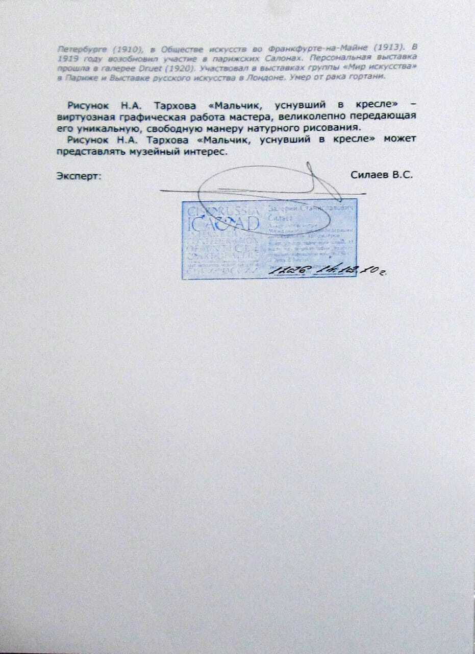 Представленная работа относится к парижскому периоду творчества Николая Тархова — времени его наивысшего признания во Франции. К 1910 году художник уже был членом жюри Осеннего салона, его работы высоко ценили критики, а самобытный импрессионистический стиль мастера обрел полную зрелость. В центре композиции — образ, редкий для творчества Тархова по своей камерности и психологической глубине. Фигура уснувшего в кресле мальчика (вероятно, одного из троих детей художника) решена не в привычной живописной манере, а в изысканной графической технике туши. Работа выполнена на бумаге, дублированной на холст, что придает ей особую фактурную выразительность. Тархов выступает здесь как тонкий рисовальщик. Свободными, почти невесомыми штрихами кисти он лепит объем, передает расслабленность спящего тела и уютную атмосферу домашнего интерьера. Характерная для импрессиониста «стихия движения» (по определению Малевича) проявляется здесь в вибрации линии, в прозрачности заливок и энергии беглого, но точного мазка. Это произведение ценно не только как самостоятельный художественный объект, но и как интимная страница жизни мастера. Известно, что семья была для Тархова главной опорой и источником вдохновения, а сцены с женой и детьми отличались особым теплом. Графические работы Тархова встречаются в собраниях значительно реже его живописных полотен, что придает данному листу особую коллекционную ценность. Работы Николая Тархова хранятся в Государственной Третьяковской галерее, Государственном Русском музее, Музее русского импрессионизма и Музее Пти-Пале в Женеве.