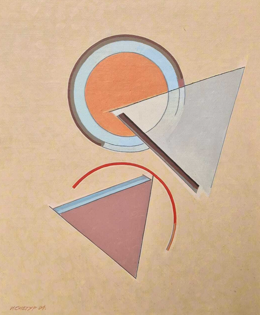 Картина «Два треугольника с кругом» создана Игорем Снегуром в 2004 году и относится к периоду активного обращения художника к геометрической абстракции. В это время мастер создает ряд произведений, исследующих взаимоотношения первичных форм, о чем свидетельствуют работы «Ускользающий квадрат» и «Квадрат с репликой», также датированные 2004 годом. Главной темой творчества Снегура на протяжении десятилетий остается «взаимоотношение пространства и времени». В представленной композиции это философское измерение раскрывается через диалог двух треугольников и круга. Художник выстраивает напряженную пластическую сцену, где геометрические фигуры существуют не как статичные объекты, а как живые, пульсирующие формы в непрерывном взаимодействии со средой. Особое внимание Снегур уделяет линии — «она свободна, она не статична». Эта свобода проявляется в том, как контуры фигур вибрируют, впуская в себя пространство фона. Цветовое решение строится на тончайших отношениях и нюансах, создающих эффект внутреннего свечения и медитативной глубины. Геометрия здесь перестает быть холодным расчетом и становится языком для разговора о вечном — о гармонии целого и его частей, о замкнутости формы и ее открытости миру. Размер 60 х 50 см придает работе камерное звучание, располагая к длительному созерцательному контакту. Произведение подписано автором и датировано; на обороте, по обыкновению художника, присутствует развернутая авторская надпись с названием. Работа оформлена в раму.